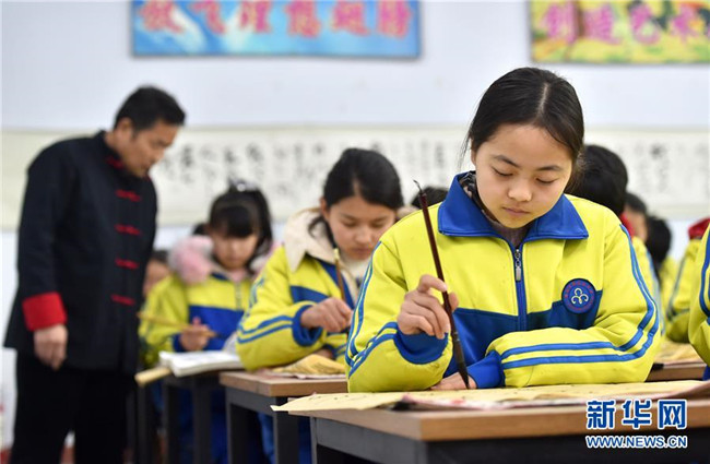 2月28日,在石家莊市藁城區(qū)韓家洼中學(xué),學(xué)生在練習(xí)寫(xiě)毛筆字。新華社發(fā)(張曉峰 攝)