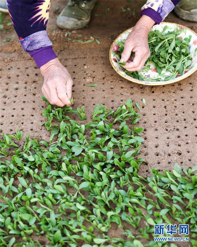 3月11日,在明光市管店鎮(zhèn)甜葉菊育苗扶貧基地,農(nóng)戶在扦插甜葉菊苗。 新華社記者 曹力 攝