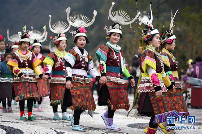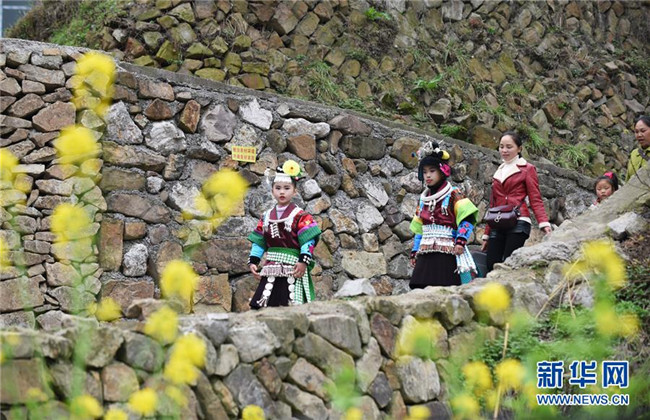 3月16日,在丹寨縣南皋鄉(xiāng)清江村,苗族姑娘在前往參加翻鼓節(jié)活動途中。 當日,貴州省黔東南苗族侗族自治州丹寨縣南皋鄉(xiāng)清江村清江村舉行翻鼓節(jié)。翻鼓節(jié)是當?shù)孛缱宕迕裼哟焊絹淼拿袼坠?jié)日,至今已有近600年歷史,每年農(nóng)歷二月舉行。 新華社記者 楊文斌 攝