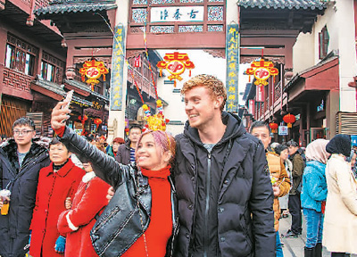 外國游客在南京夫子廟游玩時(shí)自拍留影。谷昌旺攝