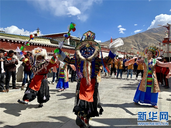 國(guó)家級(jí)藏戲傳承人班典旺久(中)。新華網(wǎng) 達(dá)珍 攝