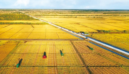 中國人要把飯碗端在自己手里,而且要裝自己的糧食。改革開放40多年來,我國農(nóng)業(yè)農(nóng)村現(xiàn)代化建設(shè)取得重要進(jìn)展,農(nóng)業(yè)物質(zhì)技術(shù)裝備水平不斷提高,確保糧食安全的基礎(chǔ)更加牢固。黑龍江是我國糧食生產(chǎn)大省,2018年糧食產(chǎn)量超過1500億斤,實(shí)現(xiàn)“十五連豐”。圖為無人機(jī)航拍的大型農(nóng)機(jī)在黑龍江省三江平原一處稻田收割水稻。 新華社記者 王建威/攝