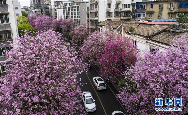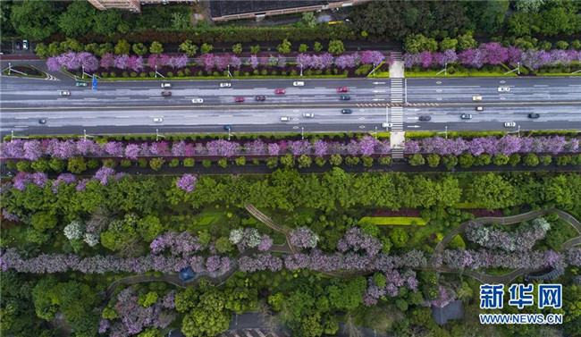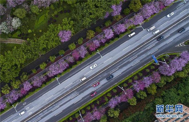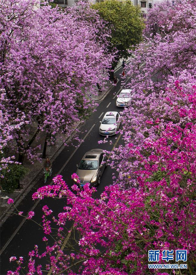當(dāng)日,一場(chǎng)大雨過(guò)后,廣西柳州市內(nèi)的洋紫荊開得格外嬌艷。時(shí)下,柳州市區(qū)27萬(wàn)株洋紫荊進(jìn)入盛花期。 新華社記者 黃孝邦 攝
