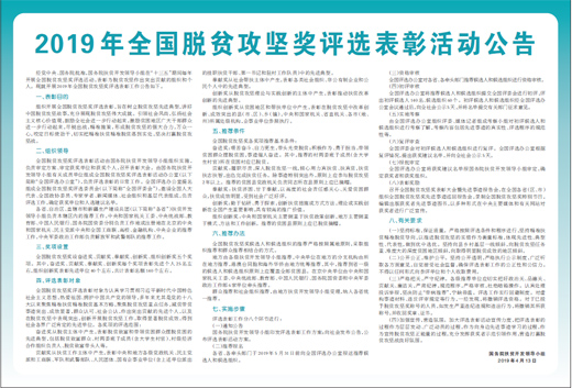 經(jīng)黨中央、國務(wù)院批準(zhǔn),國務(wù)院扶貧開發(fā)領(lǐng)導(dǎo)小組在“十三五”期間每年開展全國脫貧攻堅(jiān)獎(jiǎng)評(píng)選活動(dòng),表彰為脫貧攻堅(jiān)作出突出貢獻(xiàn)的組織和個(gè)人。現(xiàn)就開展2019年全國脫貧攻堅(jiān)獎(jiǎng)評(píng)選表彰工作公告如下。