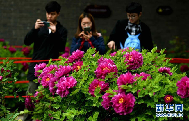 4月13日,游客在石家莊市正定榮國(guó)府影視基地游覽拍照。時(shí)下,河北石家莊正定榮國(guó)府影視基地內(nèi)的牡丹花次第開放,在春雨的滋潤(rùn)下顯得格外晶瑩剔透、美麗嬌艷。 新華社發(fā)(陳其保 攝)