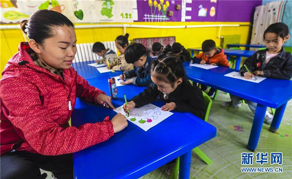 4月21日,在河北省饒陽縣小哈佛幼兒園開展的“愛護地球 從我做起”主題活動中,老師指導學生手繪愛護地球環(huán)境繪畫作品。