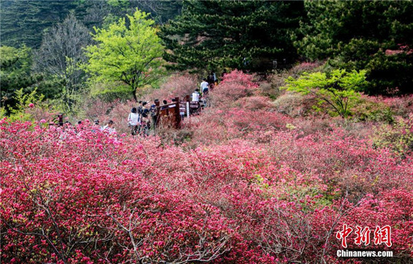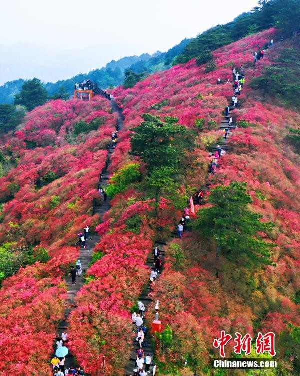 4月20日,游客在龜峰山的杜鵑花海游玩。近日,湖北省麻城市龜峰山的古杜鵑花盛開,大量游客前來賞花觀景。中新社記者 汪立敏 攝