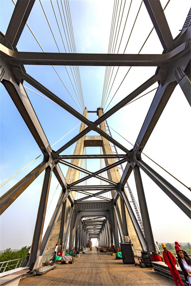 商合杭鐵路重點(diǎn)控制性工程裕溪河特大橋,主橋全長686米,主塔采用“H”型索塔,塔高123米。在我國時(shí)速350公里高速鐵路大跨度斜拉橋建設(shè)中,首次使用鋼箱桁梁結(jié)構(gòu)形式,首次在300米以上跨度橋梁中采用無砟軌道結(jié)構(gòu)形式,大橋主跨跨度達(dá)324米,建成后將成為目前世界最大跨度的無砟軌道高速鐵路橋梁。
