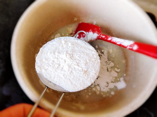 3.糖融化后立即關火,把低筋粉篩進去。