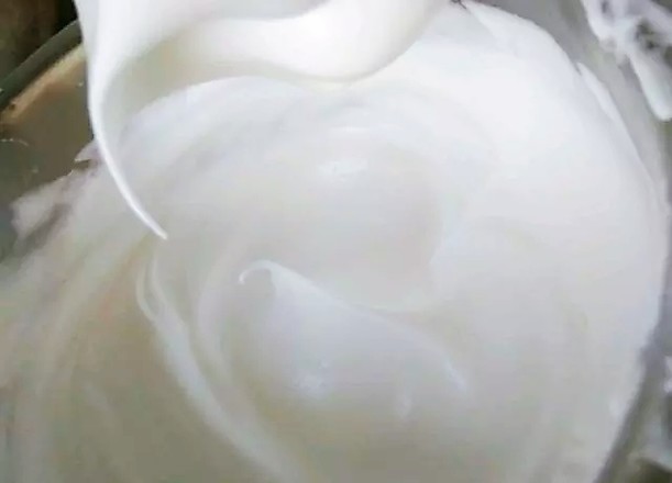 6.蛋清中滴入檸檬汁,分三次加入細砂糖,打發(fā)到小彎鉤狀態(tài)。