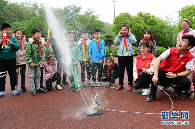 4月23日,江蘇省鎮(zhèn)江市官塘橋中心小學(xué)的學(xué)生在志愿者的帶領(lǐng)下體驗(yàn)水火箭發(fā)射。新華社發(fā)(石玉成 攝)