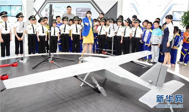 4月23日,浙江省建德市壽昌第二小學(xué)的學(xué)生們?cè)诤娇招℃?zhèn)科普展示廳內(nèi)參觀。新華社發(fā)(寧文武 攝)