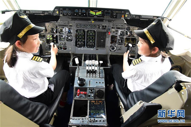 4月23日,浙江省建德市壽昌第二小學(xué)的學(xué)生在航空小鎮(zhèn)科普展示廳內(nèi)體驗(yàn)?zāi)M駕駛飛機(jī)。新華社發(fā)(寧文武 攝)