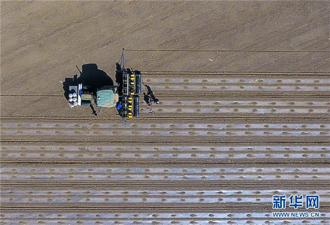 在新疆生產(chǎn)建設(shè)兵團(tuán)第六師共青團(tuán)農(nóng)場的棉花地中,一名農(nóng)場職工在無人駕駛精量播種機(jī)播種之后的棉田上,檢查地膜表面壓土情況(4月22日攝)。