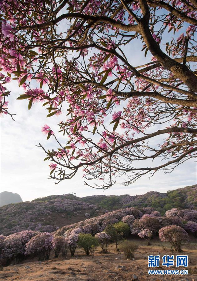 4月23日,戶外愛好者經(jīng)過龍頭山野生杜鵑花。 近日,四川省攀枝花市鹽邊縣龍頭山十余萬畝野生杜鵑花盛開,吸引省內(nèi)外游客前來登山賞花。 龍頭山位于四川省攀枝花市鹽邊縣北部的紅寶苗族彝族鄉(xiāng)境內(nèi),這里的野生杜鵑花花期為2月至5月。 新華社記者 江宏景 攝