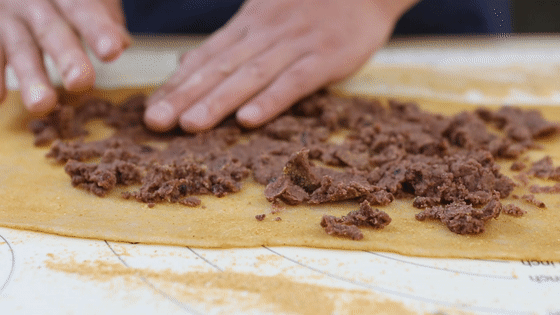 17.將紅豆餡均勻的抹在糯米面片上。(紅豆沙不能太干,太干不太好卷,也不能太稀,太稀用刀一切就流出來(lái)了。如果能買的高品質(zhì)的紅豆沙最好,做驢打滾紅豆沙是非常重要的,如果買不到口感好的紅豆沙,建議你在家自己做。)