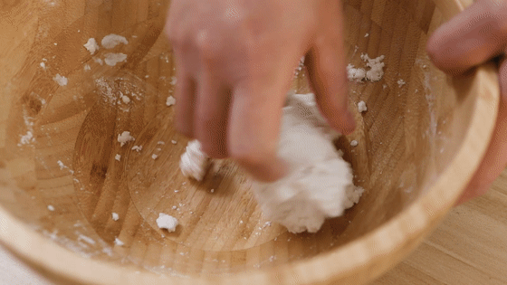 9.待其均勻吸收水分后,將結(jié)塊的糯米粉團(tuán)揉成光滑的面團(tuán)。