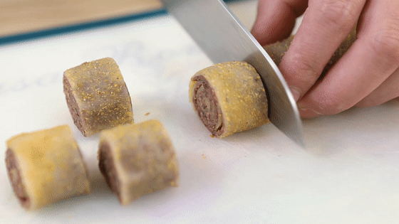 19.用刀將糯米卷切成均等的小段。