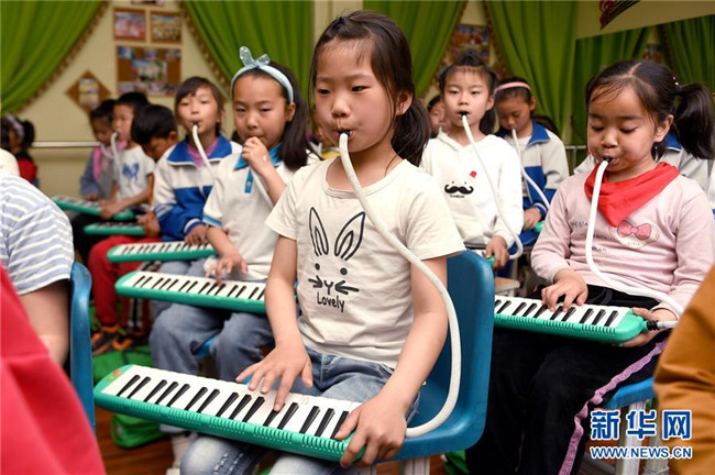陜西省延安市楊家?guī)X福州希望小學(xué)口風(fēng)琴社團(tuán)的學(xué)生練習(xí)口風(fēng)琴(4月24日攝)。