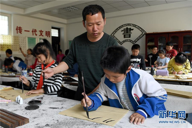 陜西省延安市楊家?guī)X福州希望小學(xué)書法社團(tuán)的學(xué)生在練習(xí)書法(4月24日攝)。