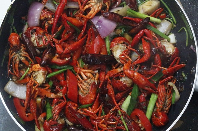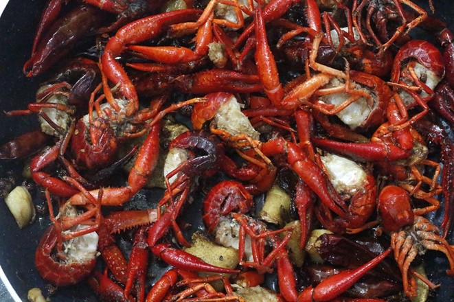 5.把清洗干凈的小龍蝦放入鍋中和紅油爆炒至變色。
