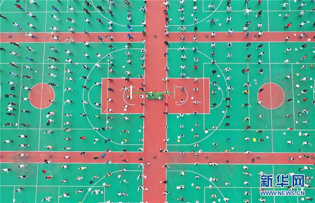 6月4日,在湖南省衡陽縣第一中學,高三學生做早操(無人機拍攝)。新華社發(fā)(曹正平攝)