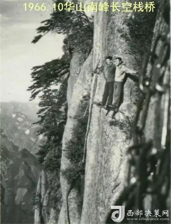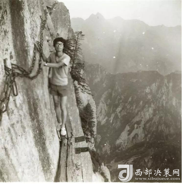 我照相的時候,一只手抓鐵鏈,一只手做動作,身體是緊貼石壁。難得的是當年一起去的一個女生給我照相,在我對面一樣危險,但女俠單手抓鐵鏈,整個身體外突懸在半空中,另一只手拿相機找一個最好角度給我拍照,我都替她擔心。——摘自網友2003年爬華山的游記