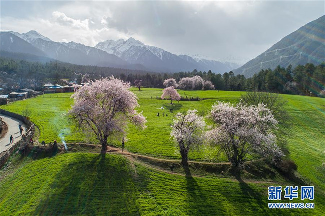 西藏林芝波密縣境內(nèi)桃花盛開的田園風光(4月5日無人機拍攝)。新華社記者 李鑫 攝