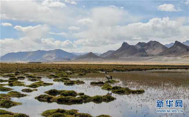 一只黑頸鶴在珠峰腳下濕地里覓食(5月17日攝)。新華社記者 晉美多吉 攝