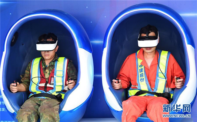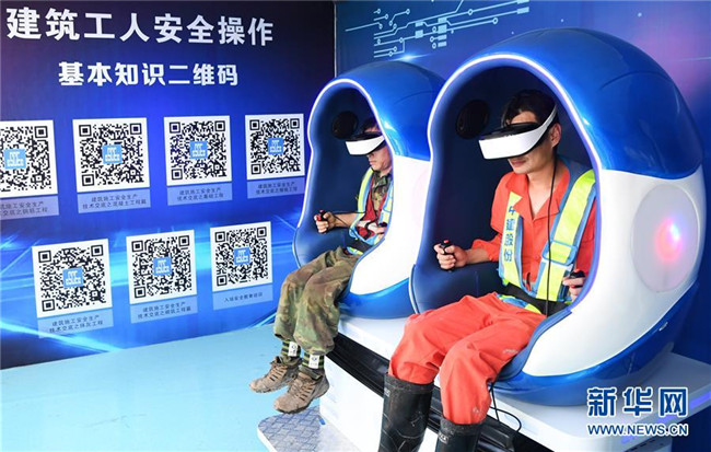 6月5日,重慶化龍橋超高層項(xiàng)目工人在VR安全體驗(yàn)館內(nèi)體驗(yàn)“高空墜落”。在VR安全體驗(yàn)館,工人們可通過(guò)VR游戲的方式親身體驗(yàn)高空墜落、消防事故處置等項(xiàng)目,了解施工過(guò)程中可能遇到的危險(xiǎn)、困難以及解決方法。 新華社記者 王全超 攝