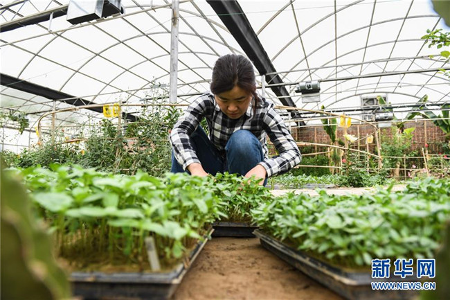 5月7日,在庫布其沙漠恩格貝生態(tài)示范區(qū)內(nèi),一名農(nóng)藝師整理培育的沙生植物苗。 新華社記者 劉磊 攝