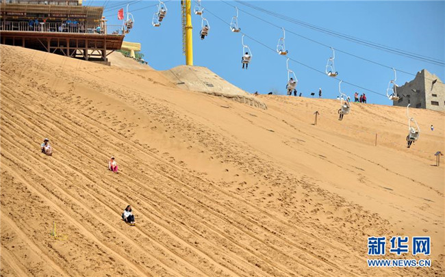 游客在寧夏中衛(wèi)市沙坡頭旅游景區(qū)游玩。沙坡頭旅游景區(qū)因地制宜發(fā)展沙漠旅游,旺季日接待游客量達兩萬人次(2018年8月22日攝)。 新華社記者 劉軍喜 攝