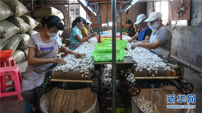 6月18日,在廣西隆林縣輕工業(yè)園區(qū)一家繅絲廠,來自易地扶貧搬遷安置點的群眾在“扶貧車間”篩選蠶繭。