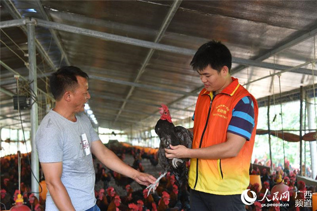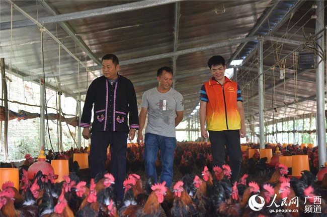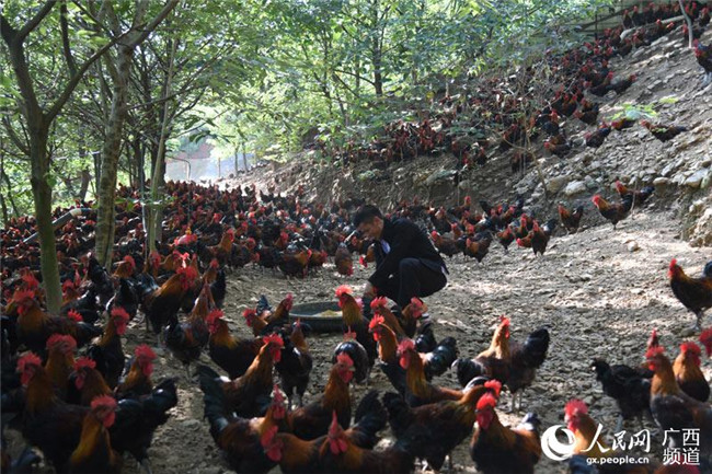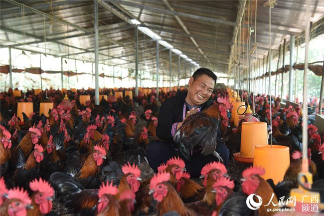 潞城瑤族鄉(xiāng)豐防村黨支部書記梁少生對養(yǎng)殖雞進(jìn)行悉心管護(hù)