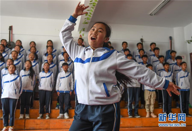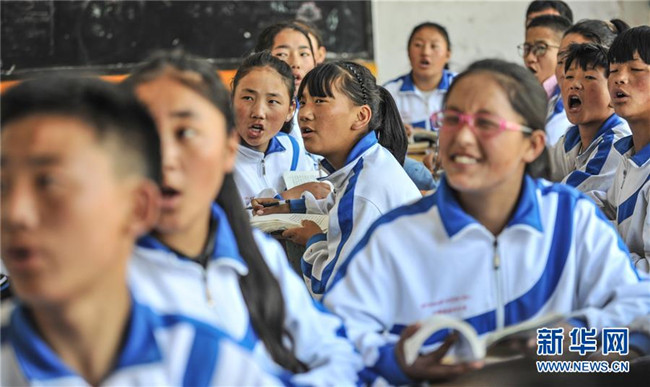 鹽井中學(xué)的學(xué)生們在上英語課(6月6日攝)。年輕的藏族女教師坐在鋼琴前,手指靈動地彈奏樂曲,兩名學(xué)生拉起弦子伴奏,三十多名學(xué)生站成四排,齊聲合唱。學(xué)?;@球場上數(shù)名身材高大的學(xué)生,正在體育老師的組織下進(jìn)行激烈的分組對抗,不一會兒,學(xué)生們個個汗流浹背。綜合樓三樓的化學(xué)實(shí)驗(yàn)室內(nèi),身穿白色大褂的學(xué)生,分成若干小組,正在做簡單的化學(xué)實(shí)驗(yàn)。這一幕幕,同時出現(xiàn)在西藏昌都市芒康縣鹽井中學(xué)。新華社記者晉美多吉攝