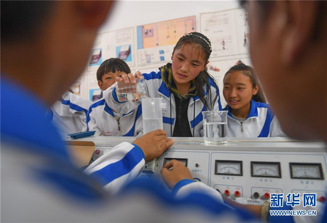 鹽井中學(xué)的學(xué)生們在上物理課(6月6日攝)。年輕的藏族女教師坐在鋼琴前,手指靈動地彈奏樂曲,兩名學(xué)生拉起弦子伴奏,三十多名學(xué)生站成四排,齊聲合唱。學(xué)校籃球場上數(shù)名身材高大的學(xué)生,正在體育老師的組織下進(jìn)行激烈的分組對抗,不一會兒,學(xué)生們個個汗流浹背。綜合樓三樓的化學(xué)實(shí)驗(yàn)室內(nèi),身穿白色大褂的學(xué)生,分成若干小組,正在做簡單的化學(xué)實(shí)驗(yàn)。這一幕幕,同時出現(xiàn)在西藏昌都市芒康縣鹽井中學(xué)。新華社記者晉美多吉攝