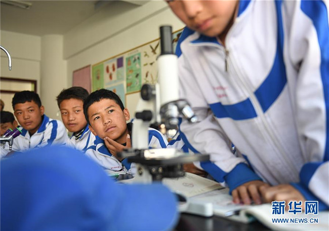 鹽井中學(xué)的學(xué)生們在上生物課(6月6日攝)。年輕的藏族女教師坐在鋼琴前,手指靈動地彈奏樂曲,兩名學(xué)生拉起弦子伴奏,三十多名學(xué)生站成四排,齊聲合唱。學(xué)?;@球場上數(shù)名身材高大的學(xué)生,正在體育老師的組織下進(jìn)行激烈的分組對抗,不一會兒,學(xué)生們個個汗流浹背。綜合樓三樓的化學(xué)實(shí)驗(yàn)室內(nèi),身穿白色大褂的學(xué)生,分成若干小組,正在做簡單的化學(xué)實(shí)驗(yàn)。這一幕幕,同時出現(xiàn)在西藏昌都市芒康縣鹽井中學(xué)。新華社記者晉美多吉攝