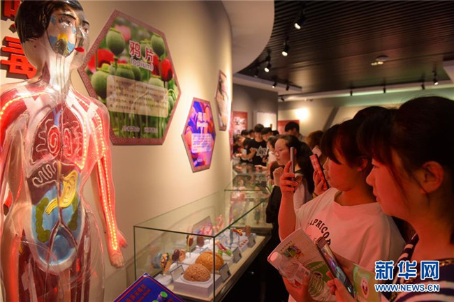 6月26日,在山東省棗莊市臺(tái)兒莊古城中學(xué)的禁毒教育基地,民警向?qū)W生介紹毒品對(duì)人體的危害。新華社發(fā)(高啟民攝)