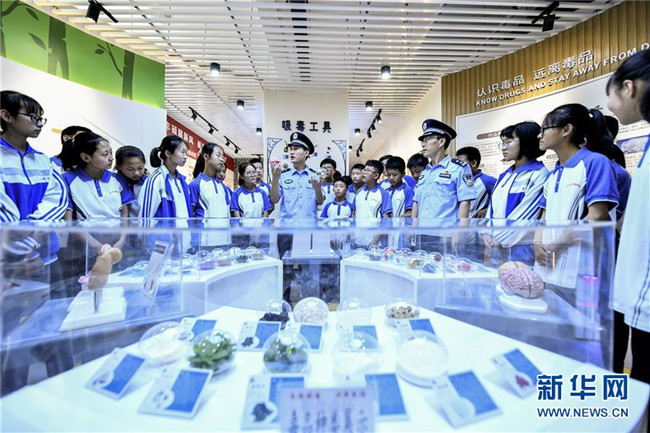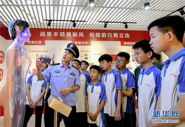 6月26日,在山東省棗莊市臺(tái)兒莊古城中學(xué)的禁毒教育基地,民警向?qū)W生介紹新型毒品的種類、特征和危害。新華社發(fā)(高啟民攝)