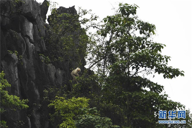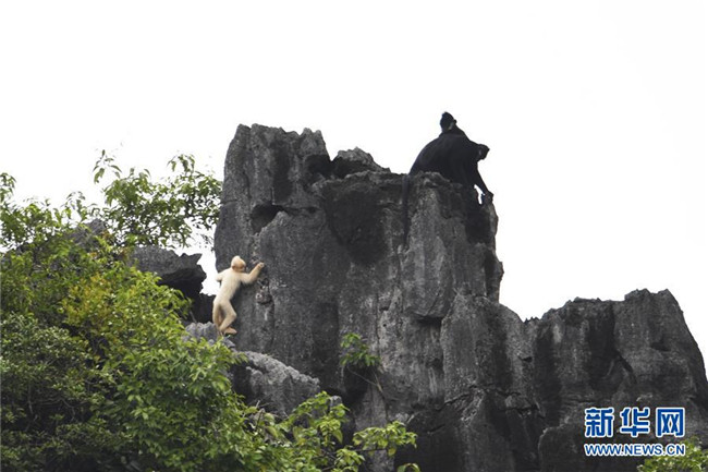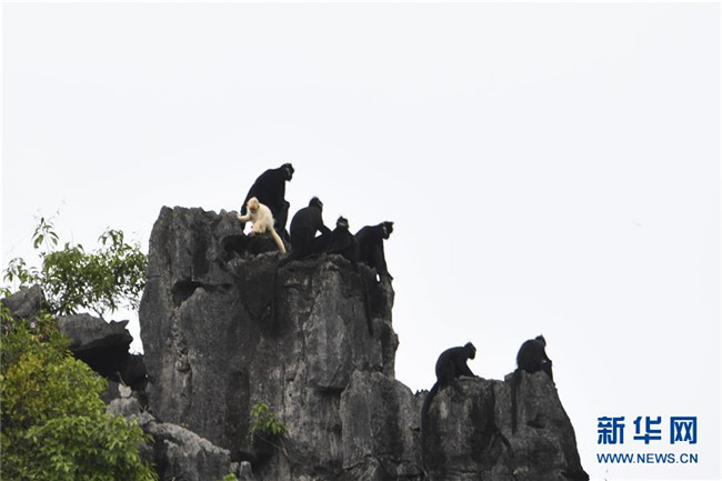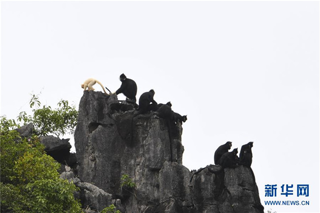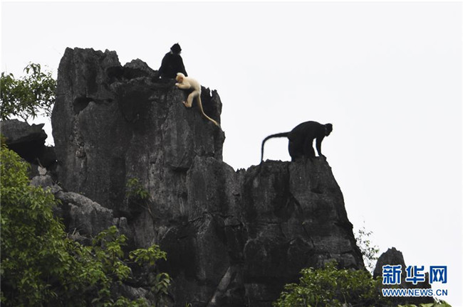 7月4日,白化黑葉猴幼體和同種群其他黑葉猴出現(xiàn)在廣西大新縣桃城鎮(zhèn)寶新村城南小學(xué)后山上。 新華社記者 曹祎銘 攝