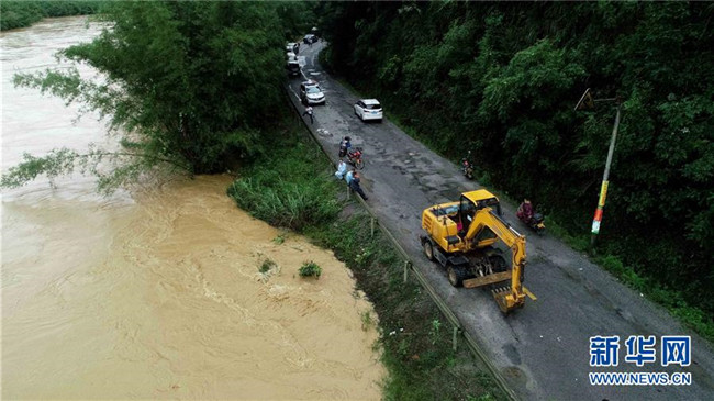 7月9日,在廣西柳州市融安縣大將鎮(zhèn)東潭村,一輛工程車輛在受災(zāi)地區(qū)待命,準(zhǔn)備搶修受損道路(無人機拍攝)。新華社發(fā)(譚凱興 攝)
