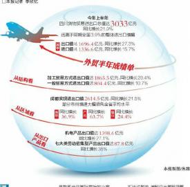 個體的表現(xiàn)匯聚成上半年四川外貿(mào)成績單:貨物貿(mào)易進出口總值達3033億元,同比增長21.9%,遠高于同期全國3.9%的整體進出口增幅。