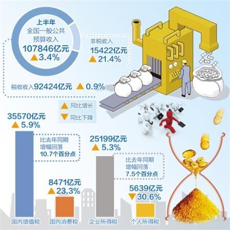 上半年,全國(guó)一般公共預(yù)算收入107846億元,同比增長(zhǎng)3.4%。其中,全國(guó)稅收收入92424億元,同比增長(zhǎng)0.9%。