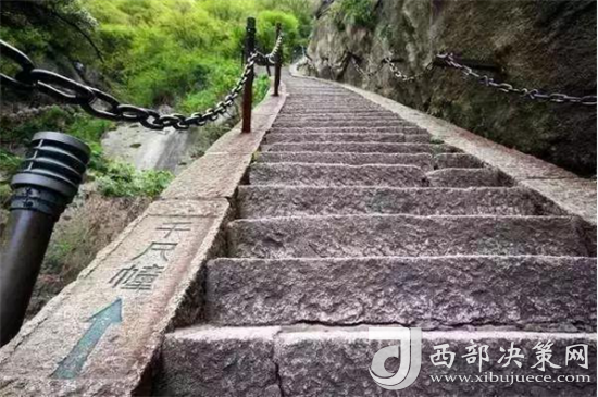 登華山有三道險(xiǎn)關(guān),合稱華山三大險(xiǎn),當(dāng)?shù)亓鱾髦@樣一句民謠:“千尺幢, 百尺峽,老君犁溝往上爬。”