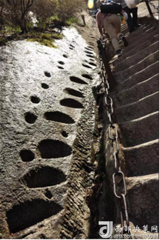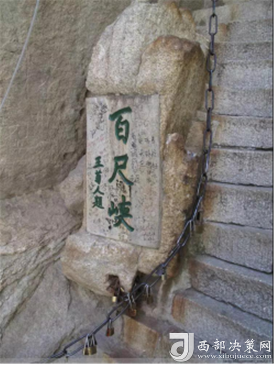 第二道險(xiǎn)關(guān)是百尺峽。這里兩壁高聳,中間夾著一塊從天而降的巨石,上刻“驚心石”三個(gè)大字,游人從石下小路穿過,確實(shí)驚心動魄。第三道險(xiǎn)關(guān)是老君犁溝,這是夾在陡峭石壁之間的一條溝狀險(xiǎn)道,有570多個(gè)石階。相傳這里原先根本沒有路,太上老君見了,就將手中的如意柄變成一張鐵犁, 又牽來青牛,一夜間犁成了這條山溝。傳說青牛犁完溝后,見華山景色壯美,便化為石牛,永遠(yuǎn)地留在了華山之上。溝的盡頭是一道陡壁, 名為“猢猻愁”。顧名思義,連猴子都發(fā)愁,可見這里的山勢多么陡峭。