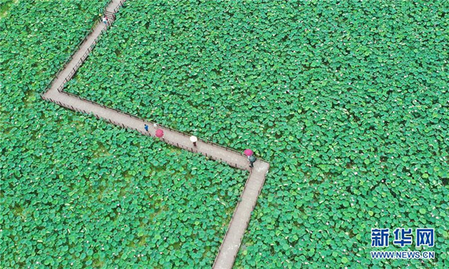 在江西省南昌市新建區(qū)聯(lián)圩鎮(zhèn),游客在當(dāng)?shù)氐那М€荷花園觀賞游玩(7月20日無人機(jī)拍攝)。