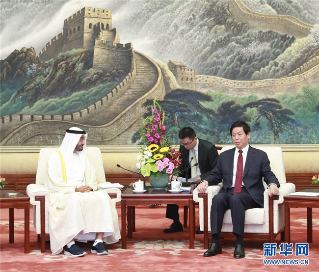 7月22日,全國(guó)人大常委會(huì)委員長(zhǎng)栗戰(zhàn)書在北京人民大會(huì)堂會(huì)見(jiàn)阿聯(lián)酋阿布扎比王儲(chǔ)穆罕默德。新華社記者 龐興雷 攝