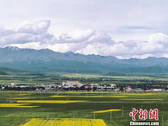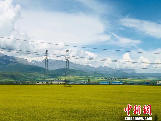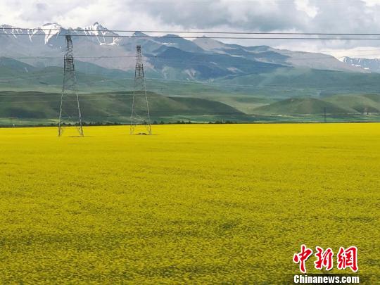 祁連山脈雪頂銀裝素裹,與油菜花交相輝映?!堟骸z