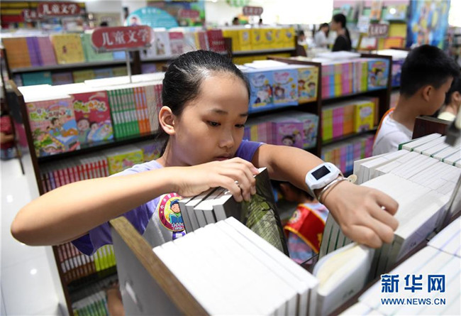 當日,廣西南寧書城在“2019年暑假好書伴我成長”沙龍活動中,征集部分小朋友在書城里擔任“小小圖書管理員”,讓孩子們親身體會到圖書管理員的艱辛與快樂。 新華社記者 陸波岸 攝
