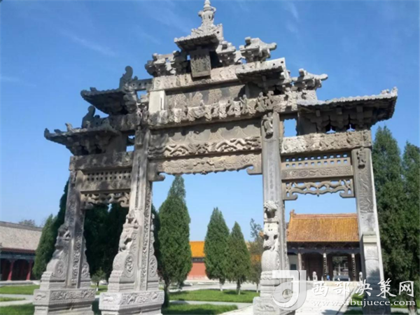 “天威咫尺”石牌樓明萬(wàn)歷年所建,結(jié)構(gòu)為四柱三開間五樓式金青石牌樓。結(jié)構(gòu)精巧,內(nèi)容豐富,雕刻手法細(xì)致、全面。運(yùn)用圓雕、浮雕、線雕、透雕等各種雕刻手法。